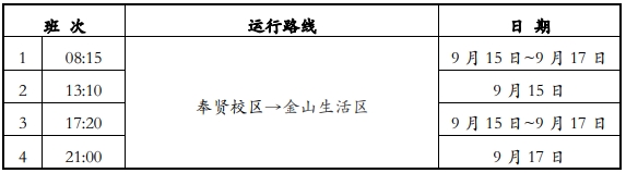 教职工班车9月14日(周六)按照工作日正常运行,9月15日-9月17日期间按照下表运行: