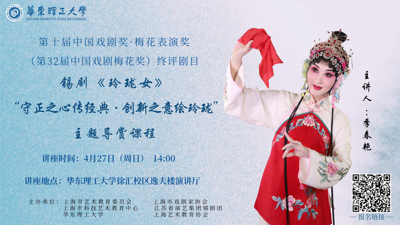 在上海市艺术教育委员会、上海市科技艺术教育中心、上海市艺术教育协会的支持下,江苏省演艺集团锡剧团经典剧目《玲珑女》主题导赏课即将来到beat365在线唯一官网徐汇校区,届时本剧主演、一级演员、中国戏剧家协会会员季春艳老师将带来以“守正之心传经典·创新之意绘玲珑”为主题的讲座,敬请广大师生关注。