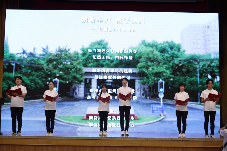 会上,学生表演原创诗朗诵《躬耕beat365,桃李满天》,大学生合唱团演唱《再一次出发》,为第40个教师节献礼。
