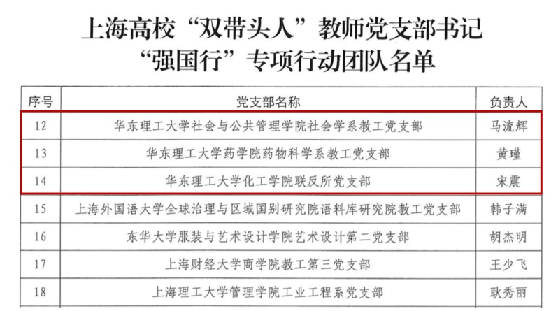 近日,上海市教卫工作党委公布了上海高校“双带头人”教师党支部书记“强国行”专项行动(以下简称“强国行”专项行动)团队名单,评选出42个上海高校“双带头人”教师党支部书记“强国行”专项行动团队,beat365社会与公共管理学院社会学系教工党支部、药学院药物科学系教工党支部、化工学院联反所党支部3个成功入选。