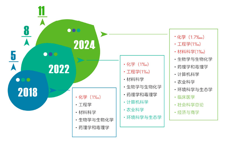 培育布局战略新兴交叉、未来学科。瞄准重大科学问题和社会需求,着眼开辟创新发展新领域新赛道,学校超前布局培育新的学科增长点,建立交叉学科发展引导机制。聚焦碳中和、新型储能、电子信息材料(电子化学品)、合成生物、智能传感、安全与社会治理等前沿领域,布局了一批国家急需、关系国计民生、支撑产业转型升级和区域发展的战略性新兴学科和未来学科:布局集成电路科学与工程、安全科学与工程、纳米科学与工程、国家安全学等学位授权点;增设“智能制造工程”等8个新专业;强化多学科交叉融合平台建设,成立碳中和未来技术学院、集成电路材料系等,为学科结构进一步优化升级奠定基础。