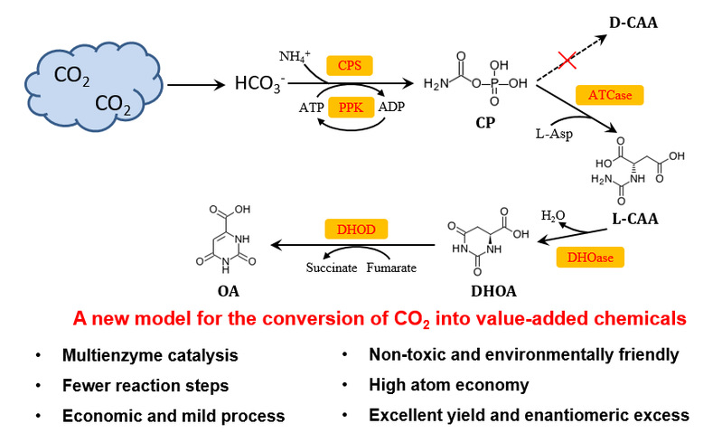Recently, the research group of Professor Li Zhimin, from the State Key Laboratory of Bioreactor Engineering, ECUST, has made the latest progress in cell-free biosynthesis by using multi-enzyme combined catalysis system.The related research papers were published in Green Chemistry entiled “Towards the Conversion of CO2 into Optically Pure n-carbamoyl-l-aspartate and Orotate by an in Vitro Multienzyme Cascade” and in Journal of Agricultural and Food Chemistry entitled “Efficient One-pot Synthesis of Cytidine 5’-Monophosphate Using an Extremophilic Enzyme Cascade System”.