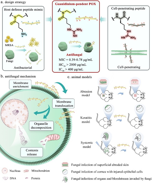 Recently, the research team of Professor Liu Runhui from the School of Materials Science, ECUST has made a breakthrough in the research of drug-resistant fungal infection. Inspired by cell-penetrating peptides, Professor Liu Runhui and other researchers used short-chain guanidinated poly (2- oxazoline) to simulate host defense peptides, and found a new idea of structural design against drug-resistant fungal infections. The research article is published in German Applied Chemistry under the title of “Short Guanidinium-Functionalized Poly(2-oxazoline)s Displaying Potent Therapeutic Efficacy on Drug-Resistant Fungal Infections” and was selected as a VIP paper.