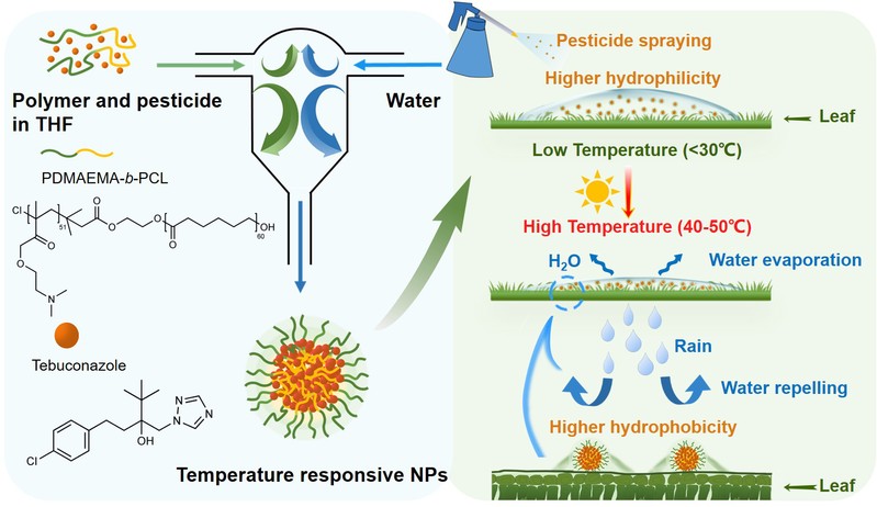 Recently, the team of Professor Xu Yisheng from the School of Chemical Engineering and Professor Huang Qingchun from the School of Pharmacy, ECUST made new progress in the design and regulation of new nano-pesticides, and the related research article was published in Nature Communications with the title of “Deposition and Water Repelling of Temperature-Responsive Nano-pesticides on Leaves”.