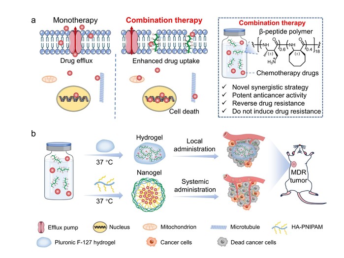 Recently, ECUST research team of Professor Liu Runhui from the School of Materials Science has made new progress in the research of reversing tumor drug resistance. The research article was published in the Journal of the American Chemical Society with the title “Reversing Anticancer Drug Resistance by SynergisticCombination of Chemotherapeutics and Membranolytic Antitumor β-Peptide Polymer”.