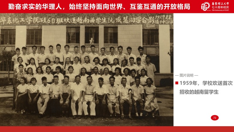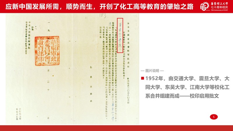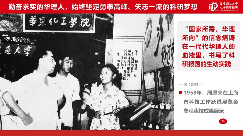 应新中国发展所需,顺势而生,学校开创了化工高等教育的肇始之路。1952年,应国家建设需要,按照“培养工业建设人才、发展专门学院”的原则,交通大学、震旦大学、大同大学、东吴大学、江南大学等校化工系强强联合,化学化工领域的高端人才辐辏云集,创建了华东化工学院。建校初期,学校设有3个系、5个专业,满怀理想信念的老一辈beat365人勤奋求实、艰苦创业,用智慧和汗水铸就了一个又一个辉煌。短短八年,学校就跻身全国重点大学行列,成为新中国创办的第一所以化工特色闻名的高等学府。