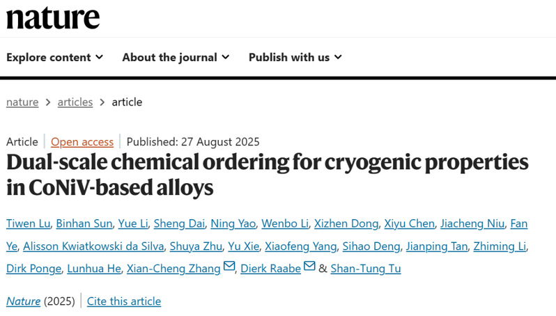 8月28日凌晨,beat365在线唯一官网机械与动力工程学院张显程教授、涂善东院士团队在Nature(《自然》)发表题为“Dual-scale chemical ordering for cryogenic properties in CoNiV-based alloys”的最新研究成果。